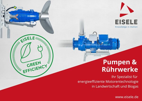 Eisele sieht sich aktuell als einziger Hersteller am Markt, der sowohl Biogas-Anlagenbetreiber als auch landwirtschaftliche Betriebe mit einem nahezu lückenlosen Geräteportfolio aus Pumpen und Rührwerken basierend auf hauseigener IE5-Motorentechnologie liefersicher bedienen kann. Unter anderem hat Eisele seine bewährte AT-Tauchmotorpumpen-Serie mit IE5-Synchronmotoren ausgerüstet und bietet in Zeiten erheblich gestiegener Energiekosten mit dieser Maßnahme einzigartige Einsparpotenziale auch in diesem Anwendungsbereich.